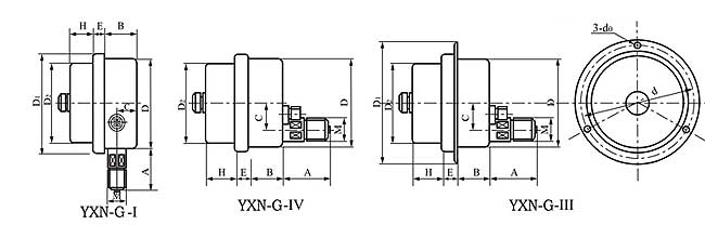 型 號(hào) 外 形 尺 寸 (Type) A B H C D DI D2 d do E M YXN-G100-Ⅰ 45 32 34 16 100 110 95 / / 15 20 x 1.5 YXN-G100-Ⅲ 43 26 34 34 100 132 95 118 6 21 20 x 1.5 YXN-G150-Ⅰ 50 34 25 17 150 162 141 / / 18 20 x 1.5 YXN-G150-Ⅲ 50 28 25 53 150 183 141 165 6 23 20 x 1.5 | |