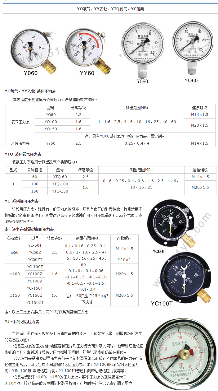 產(chǎn)品分類:YO氧氣、YY乙炔、YTQ氫氣、YC船用、YJ記憶-系列壓力表